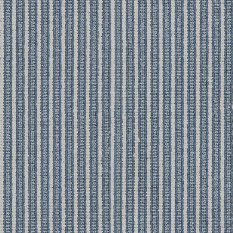 100% wool Marine Blue Harbour carpet. is a sturdy carpet with blue stripes made by Crucial Trading that may be used in the dining room, hallway, home office, and stairs.